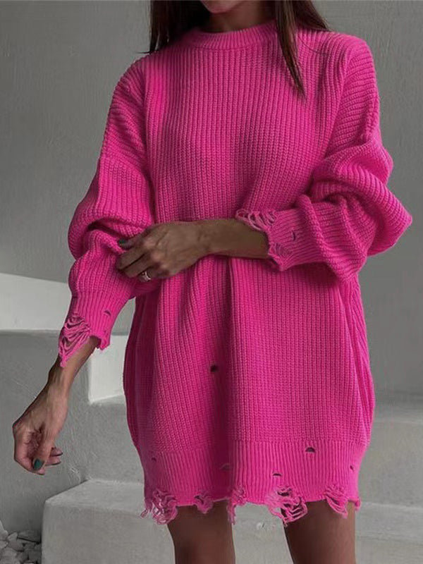 Solid Color Long Sleeve O-Neck Loose Mini Dress