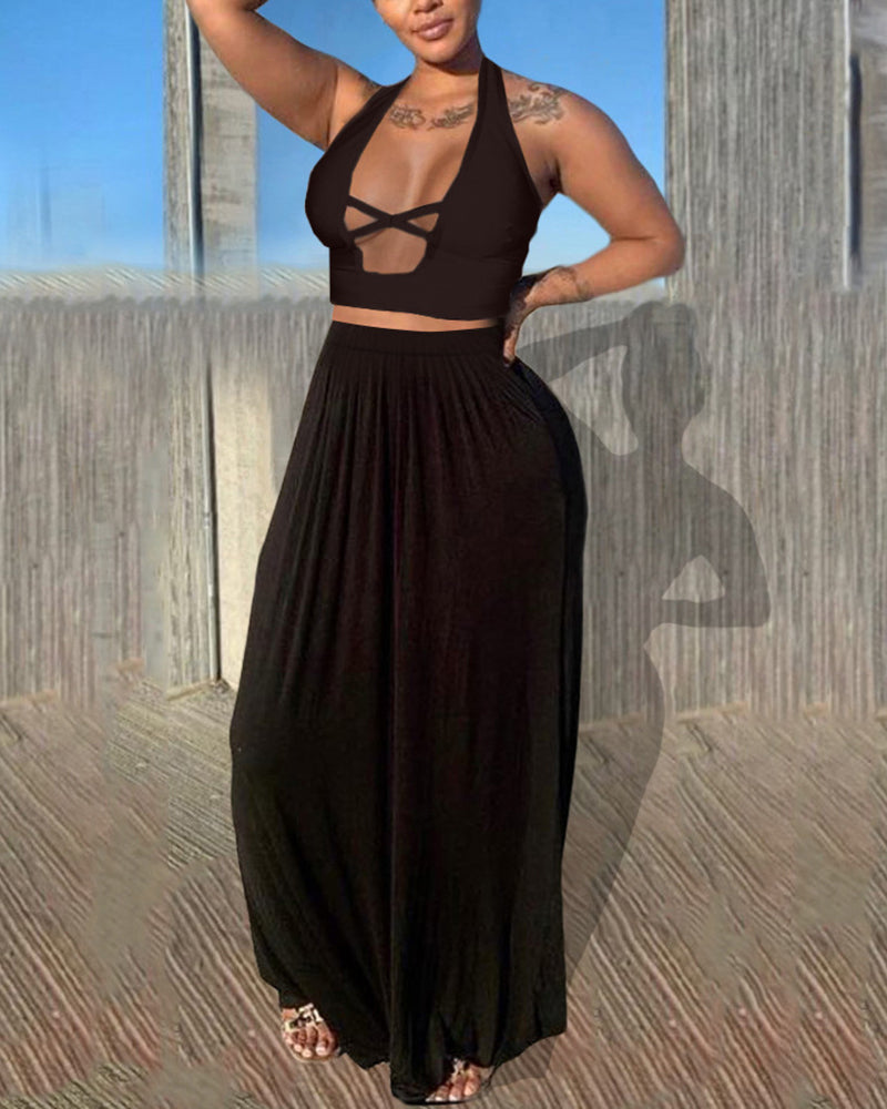 Solid Criss Cross Backless Halter Crop Top & Skirt Set