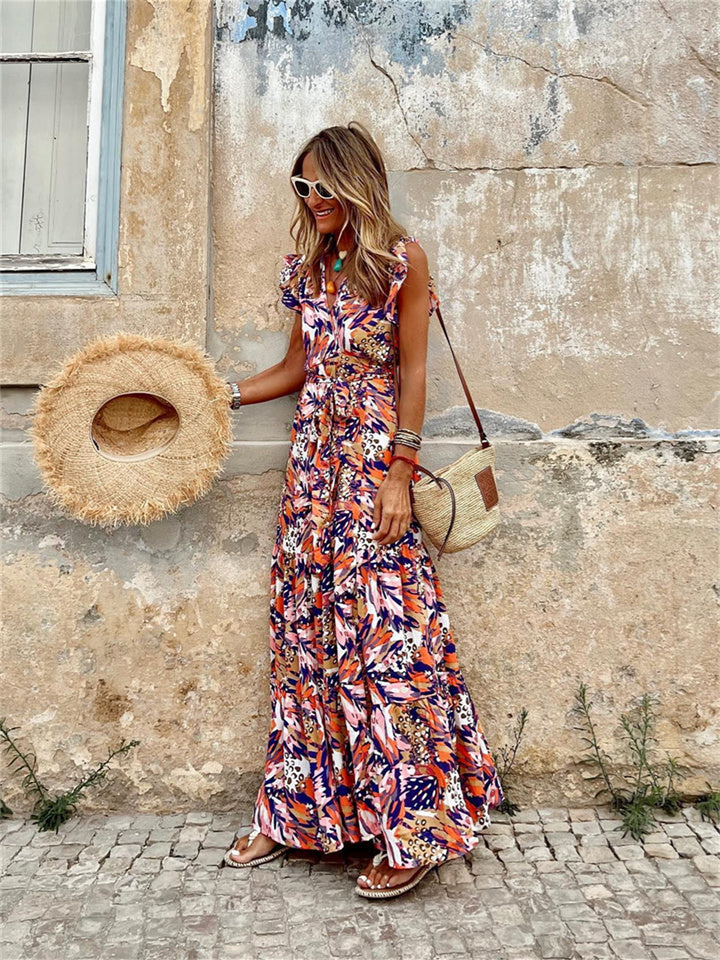 Spring and Summer Casual Temperament Women's Midriff Printed Long Dress Sleeveless V-neck Big Swing Dress Personality Street Style