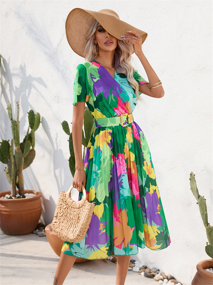 Summer Floral Print Crinkle Short Sleeve Dress V-neck Casual Dress Green Red S-2XL