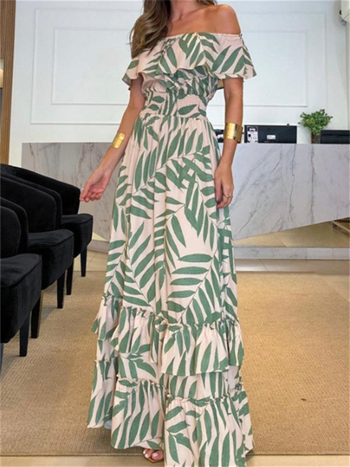 Summer Women's Printed One-piece Collar Elastic Waist Four-sided Elastic Large Swing Long Dress Vacation Dress Comfortable Casual Style S-XL