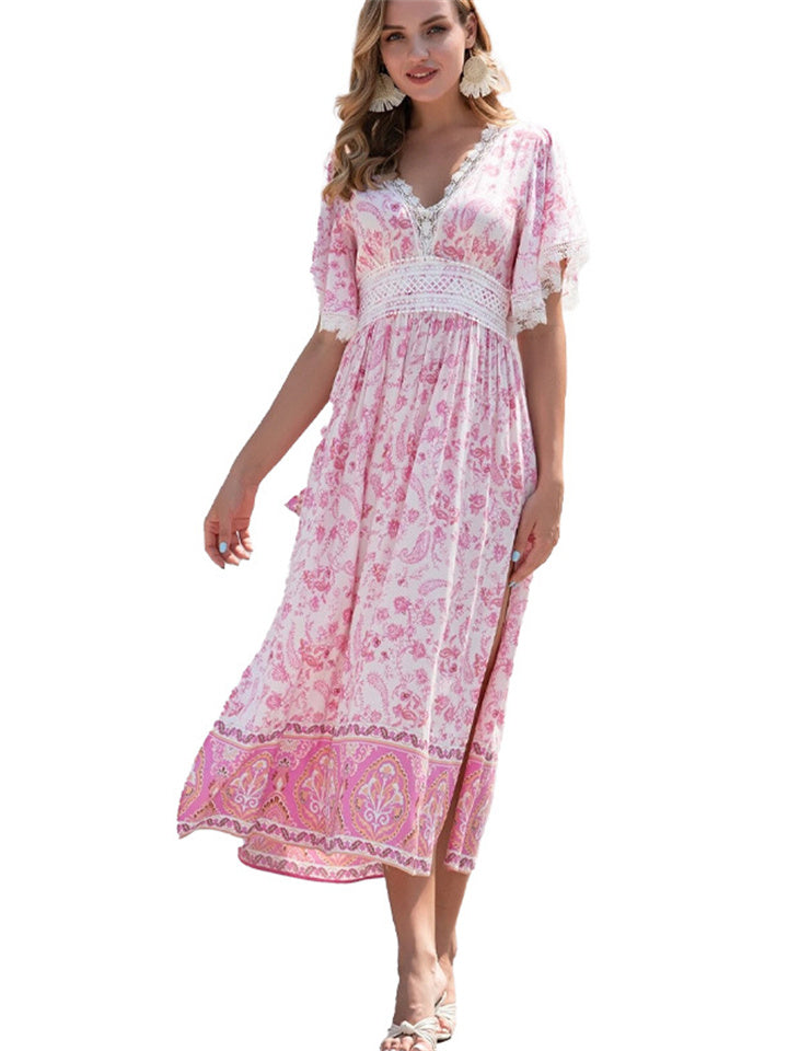Sweet and Fresh Women's Fashion Lace Lace V-neck Short-sleeved Bohemian Floral A-line Dress Dresses Tied Vacation Beach Dresses Summer
