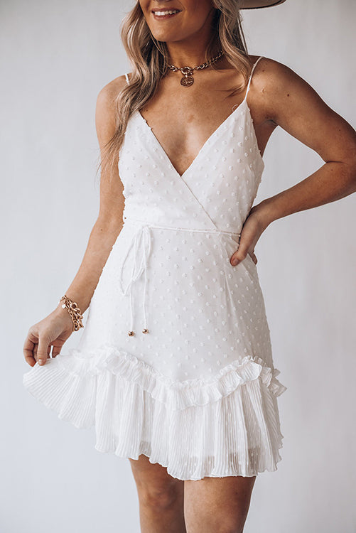 There's nothing as sweet as as our textured sheen Dress! This style has a crossover V neckline. adjustable shoulder straps and an invisible back zip. It also has belt loops. a complimentary belt and a ruffle hemline. We're getting real Grecian vibes. so style yours with a gold cuff. tousled braids and a strappy gold heel!