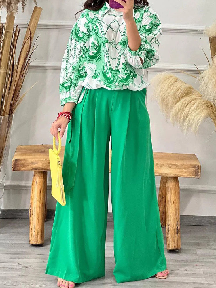 Two Piece Outfit Long Sleeve Print Blouse Top and Wide Pant Set