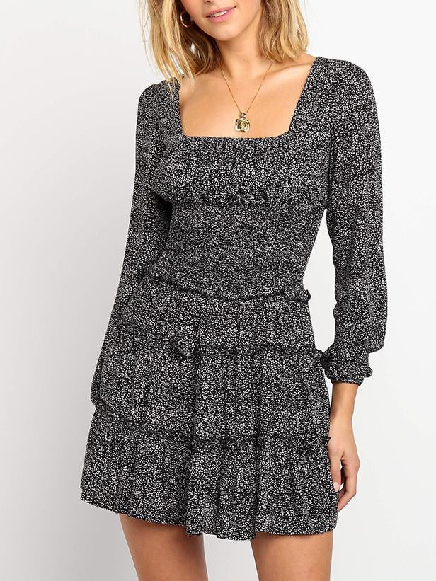 U Neck Ruffle Hem Wrap Tunic Long Sleeve Mini Dress