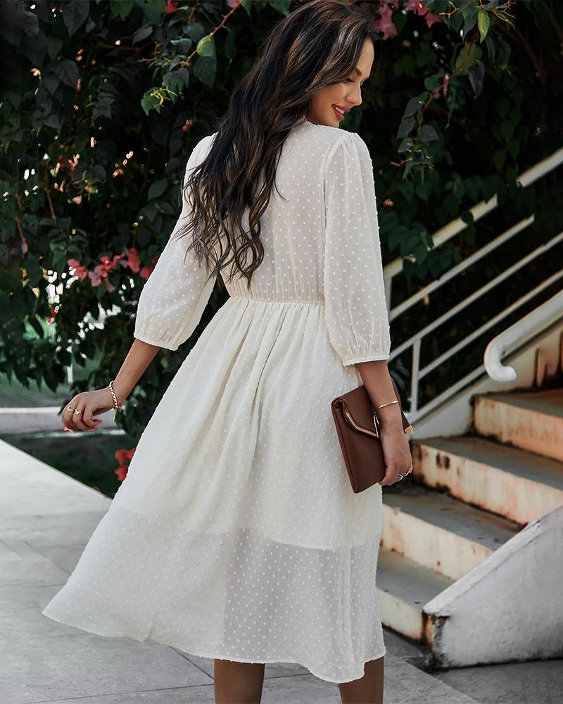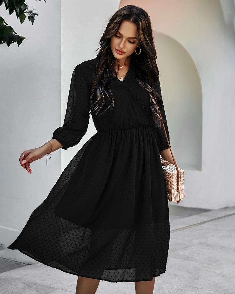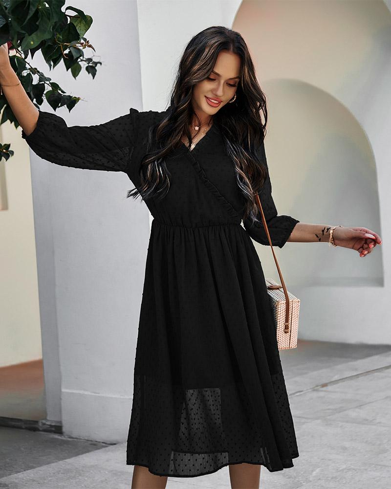 V Neck 3/4 Sleeve Polka Dot Dress Ruffle Irregular Hem