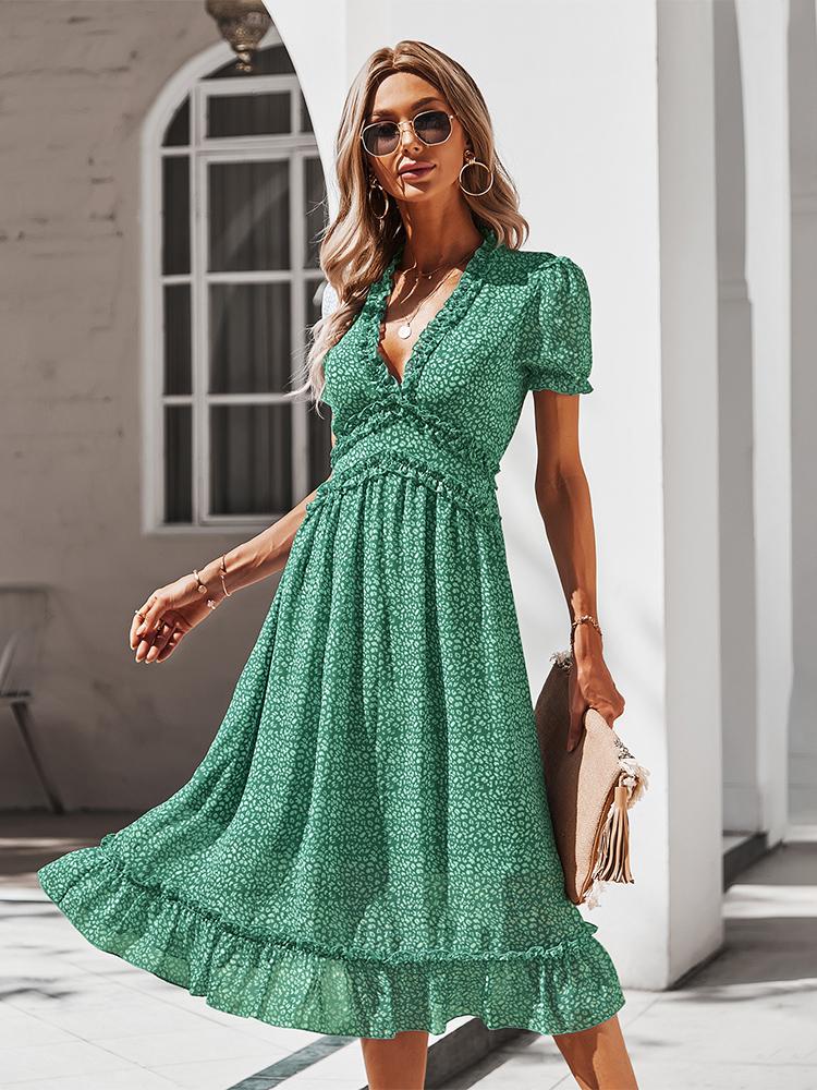 V Neck High Waist Short Sleeve Swiss Dot Maxi Dress
