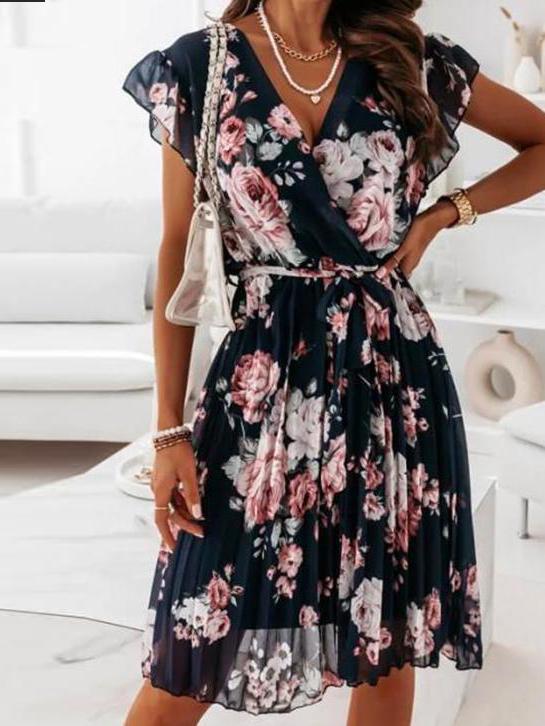 V Neck Ruffle Sleeve Pleated Floral Dress
