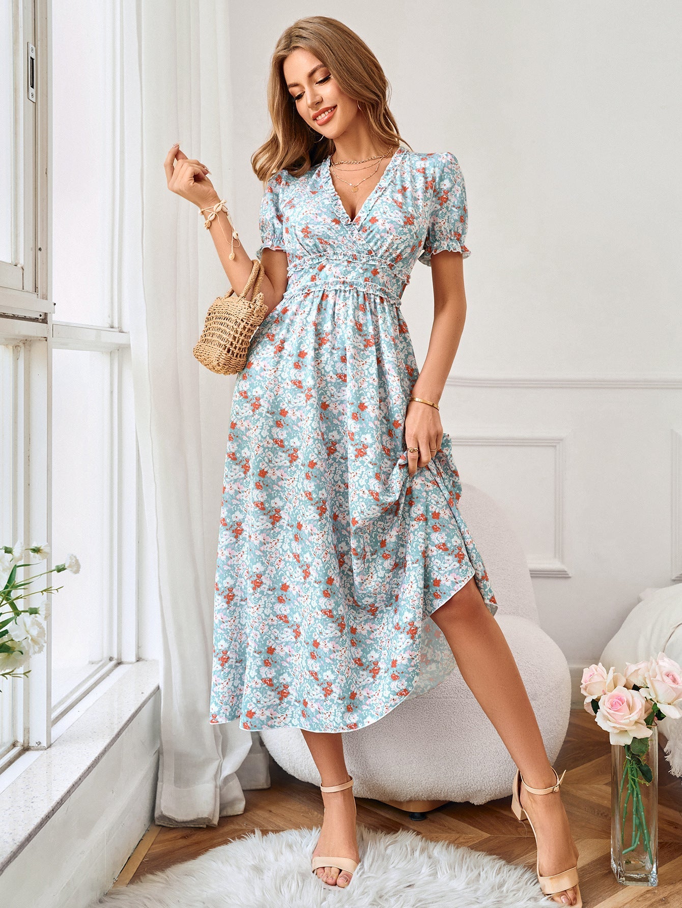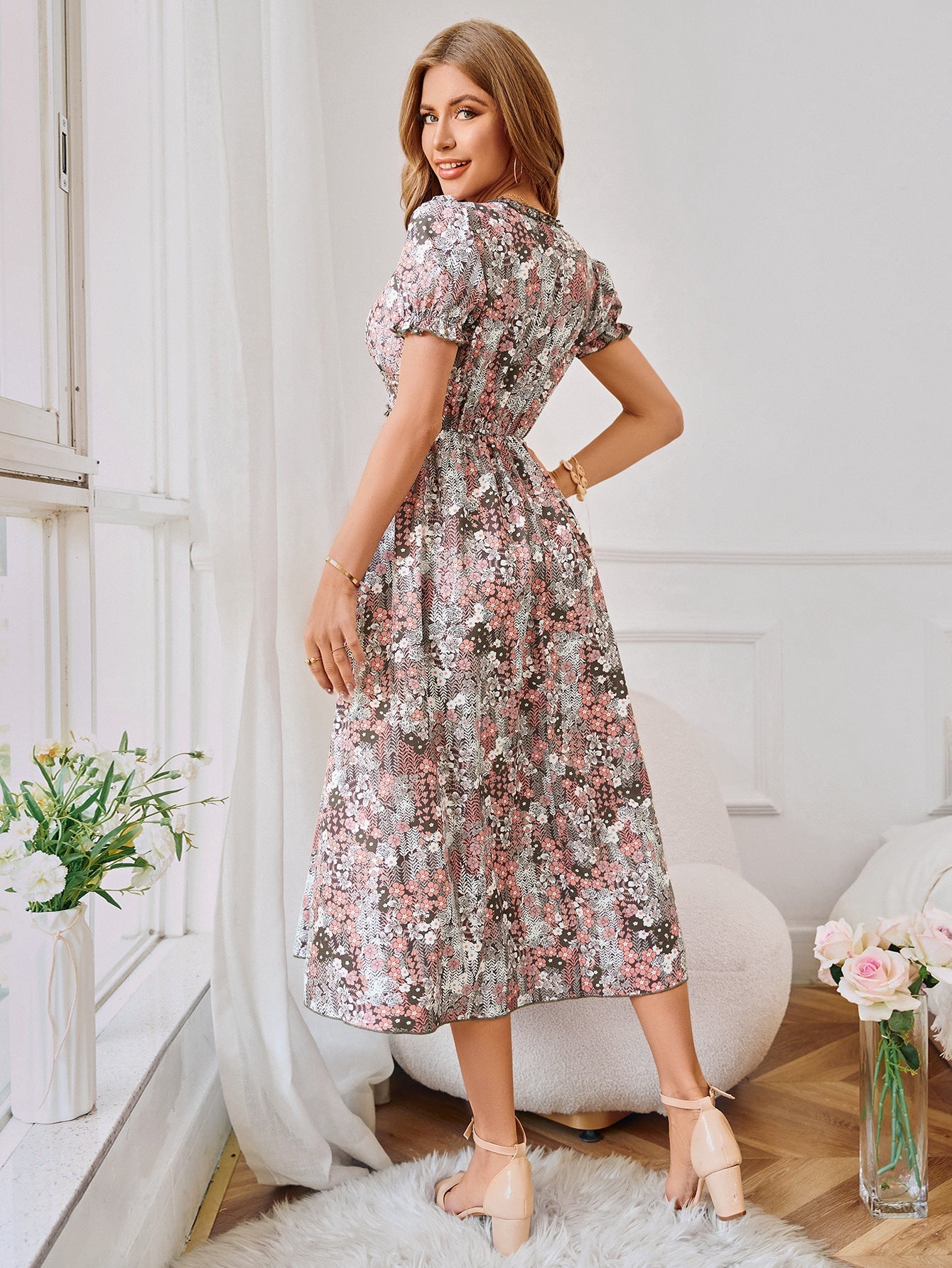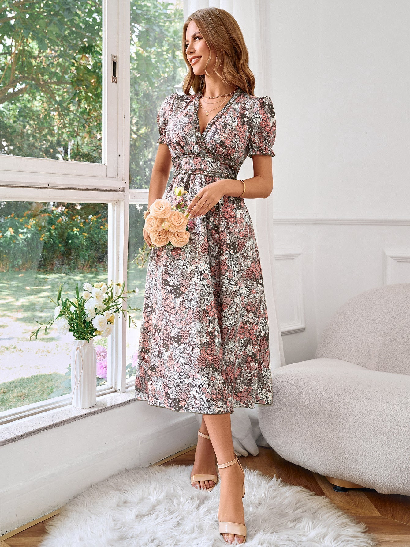 V-Neck Short Sleeve Printed Flared Midi Dress