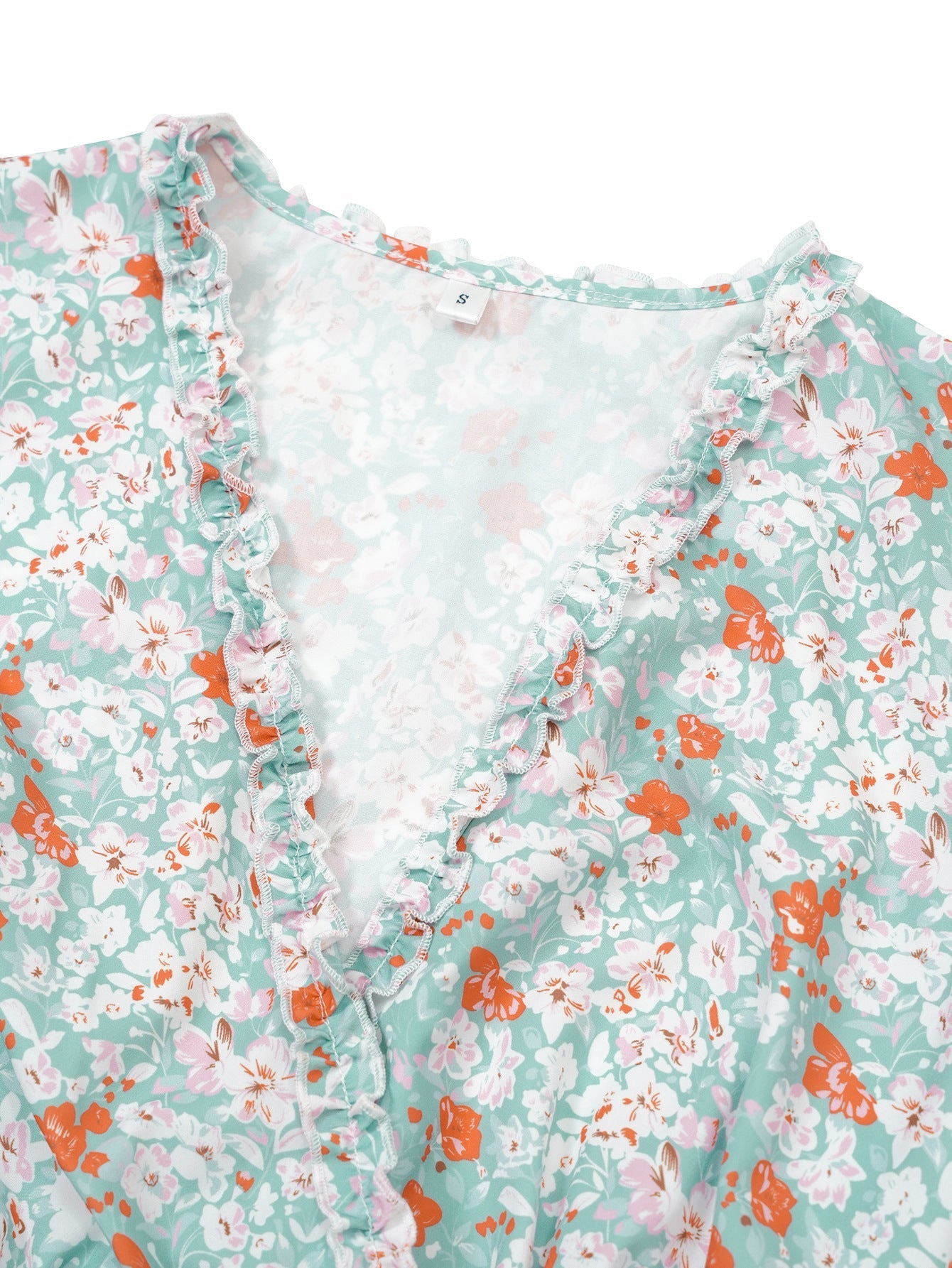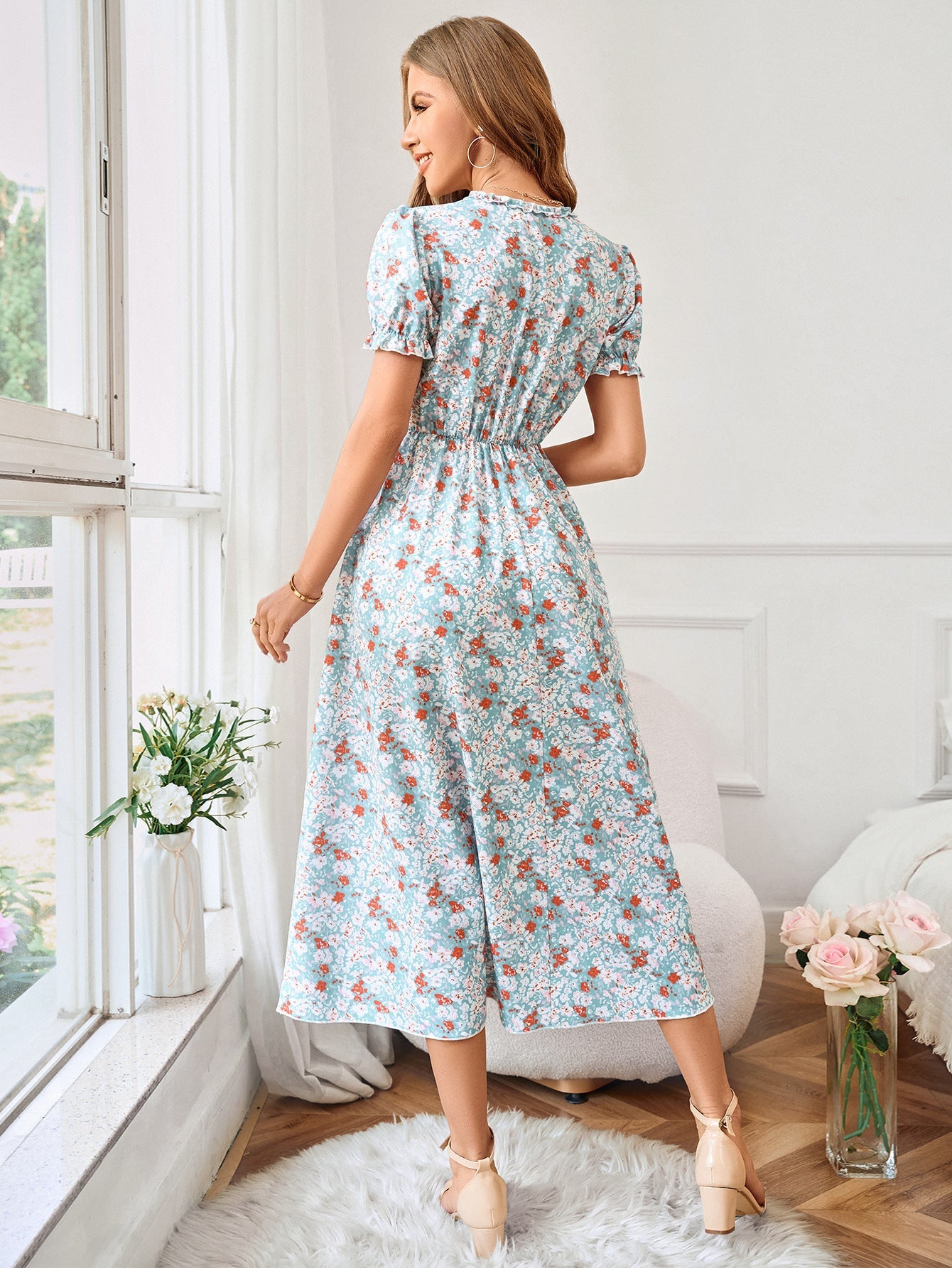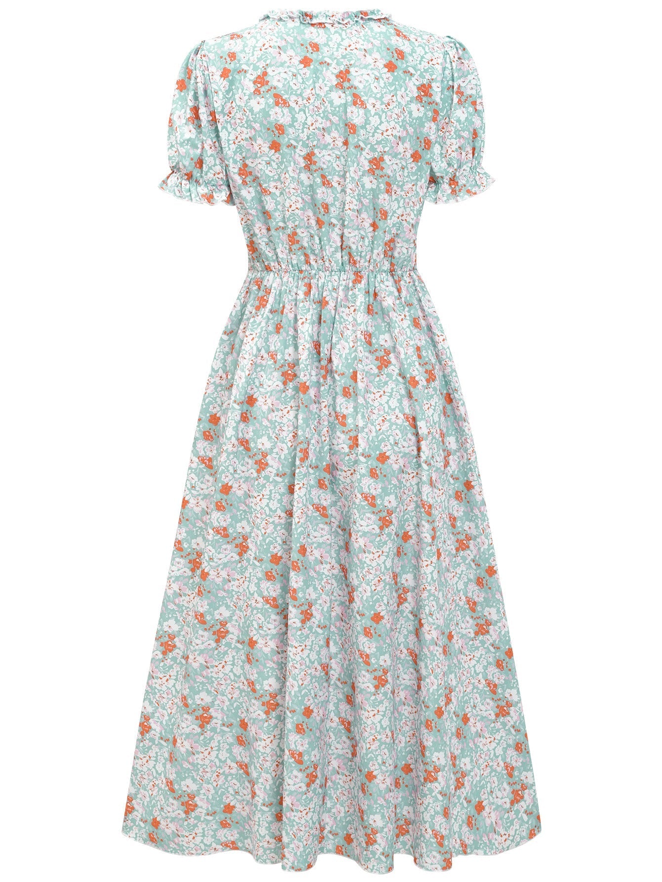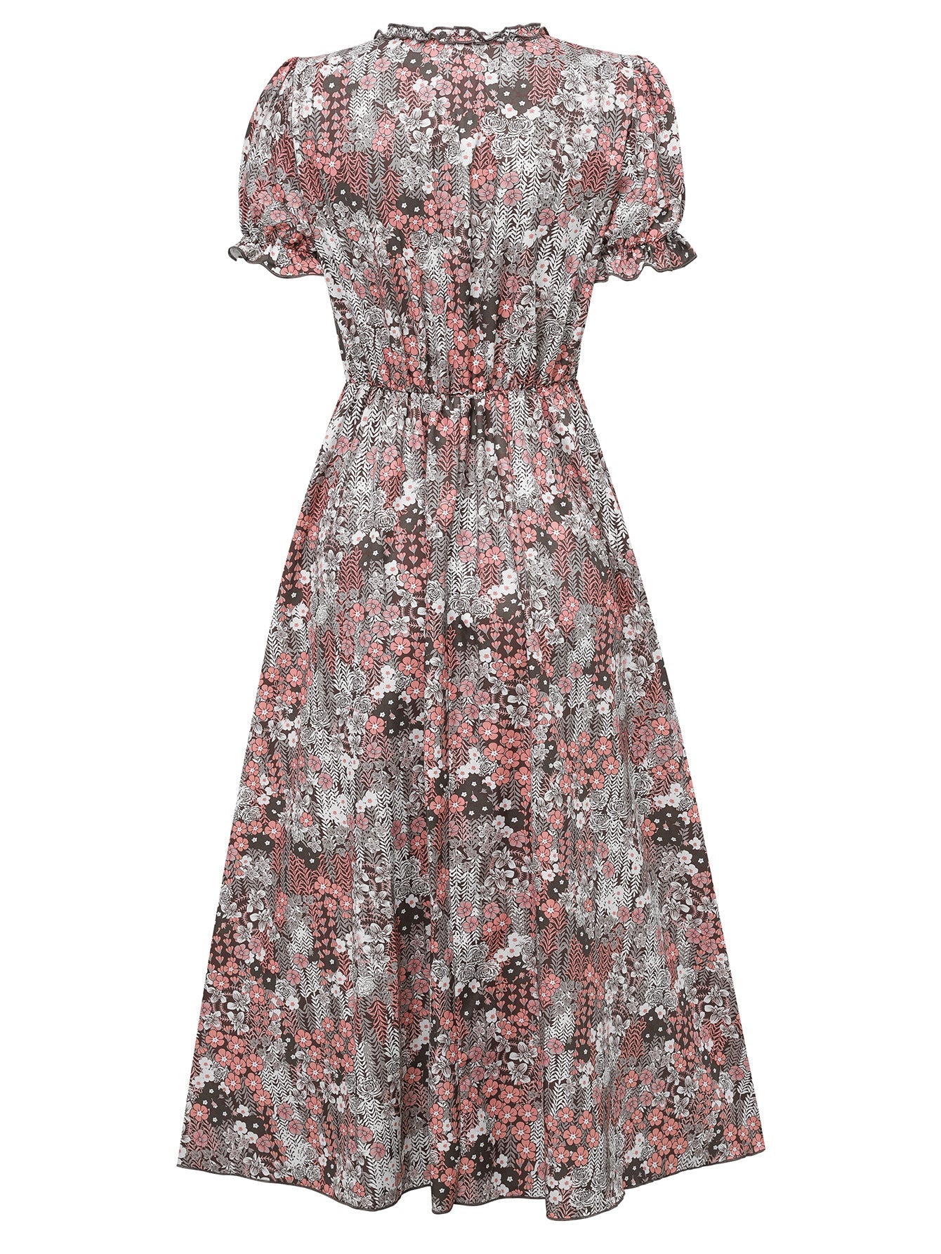 V-Neck Short Sleeve Printed Flared Midi Dress