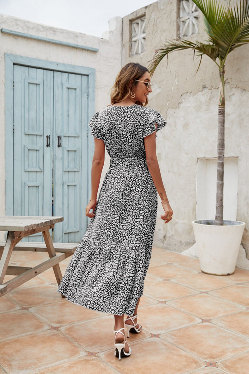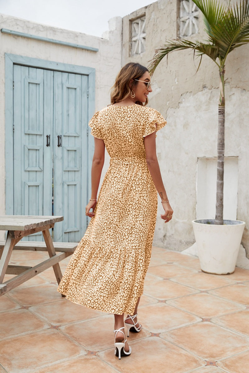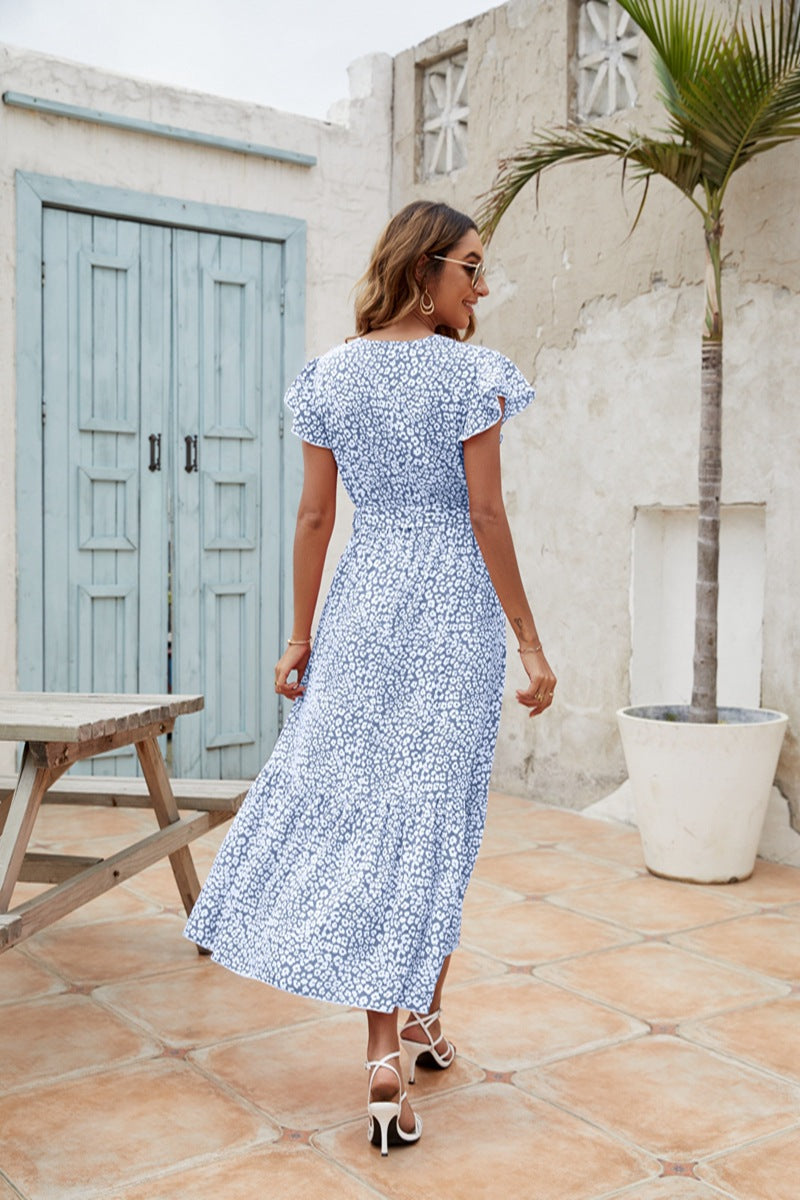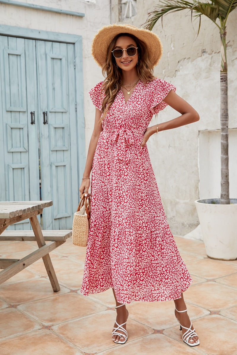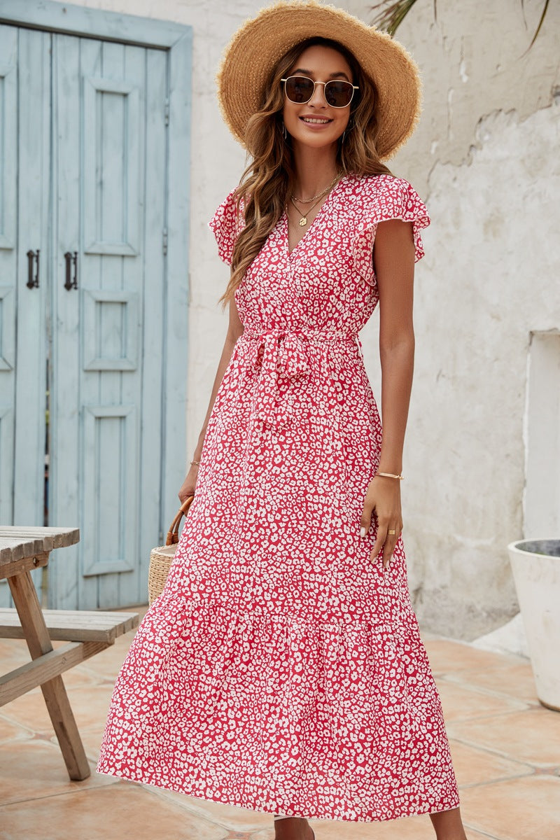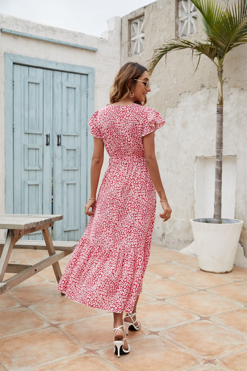 V-Neck Short Ruffle Sleeve Printed Waisted Midi Dress