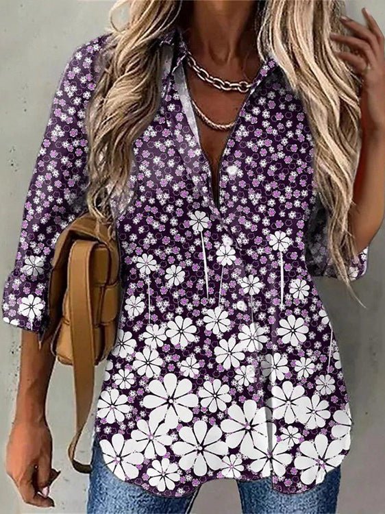 Women's Blouses Floral Lapel Button Long Sleeve Blouse