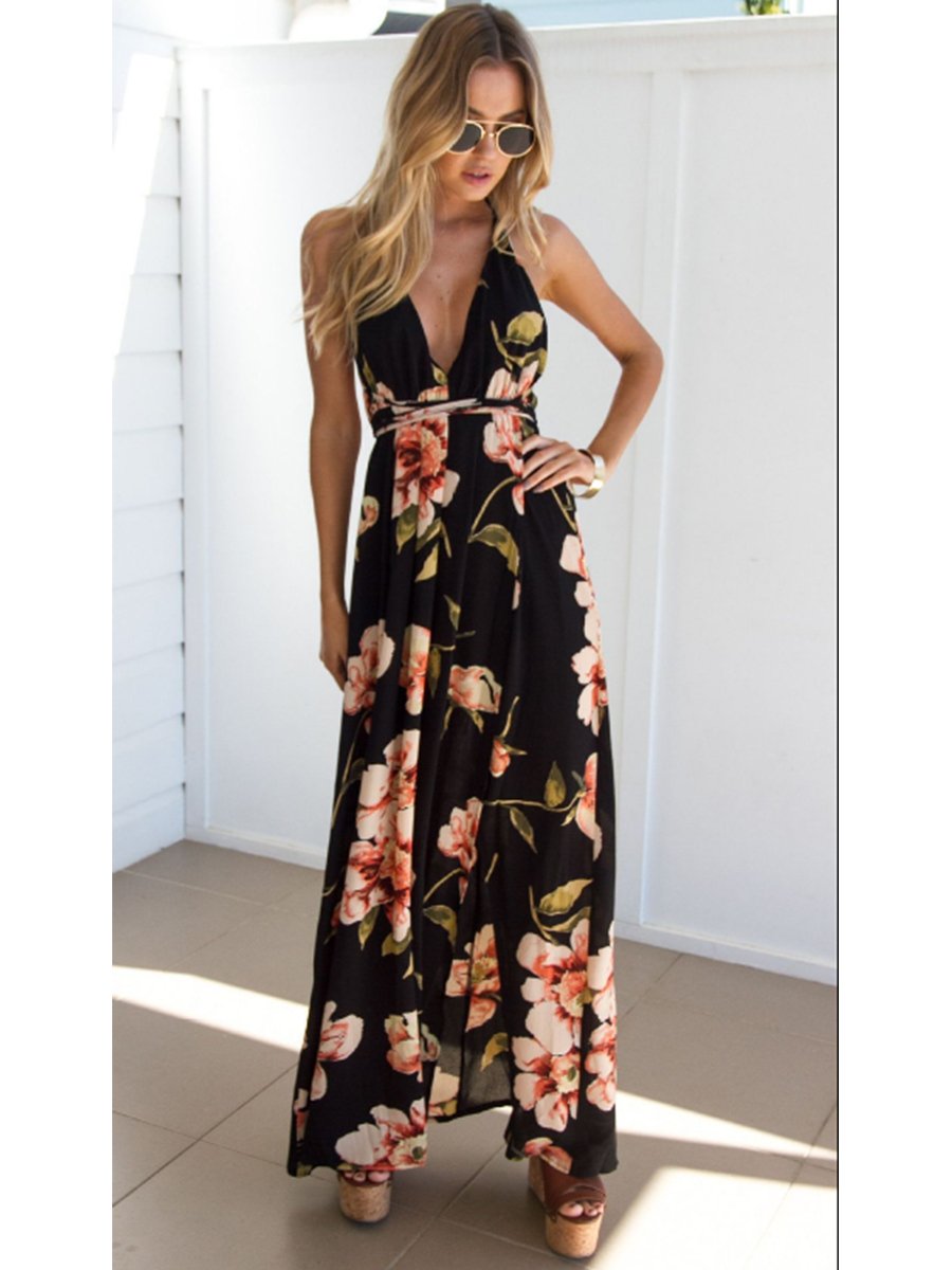 Deep V Neck Backless Spaghetti Strap Floral Casual Maxi Dress