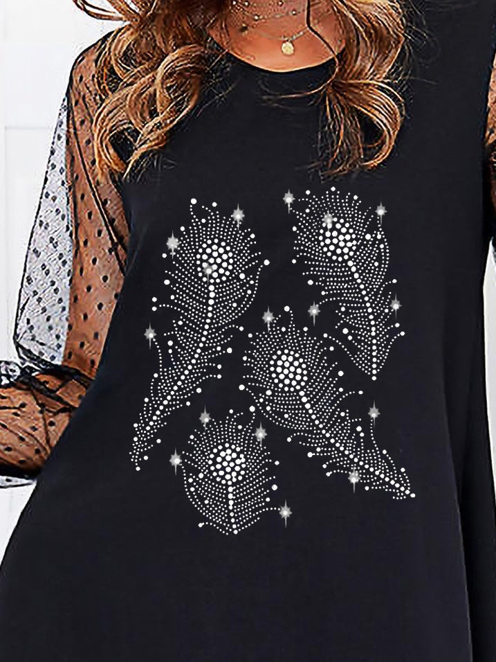 Women's Dresses Hot Rhinestone Feather Mesh Stitching Long Sleeve Dress