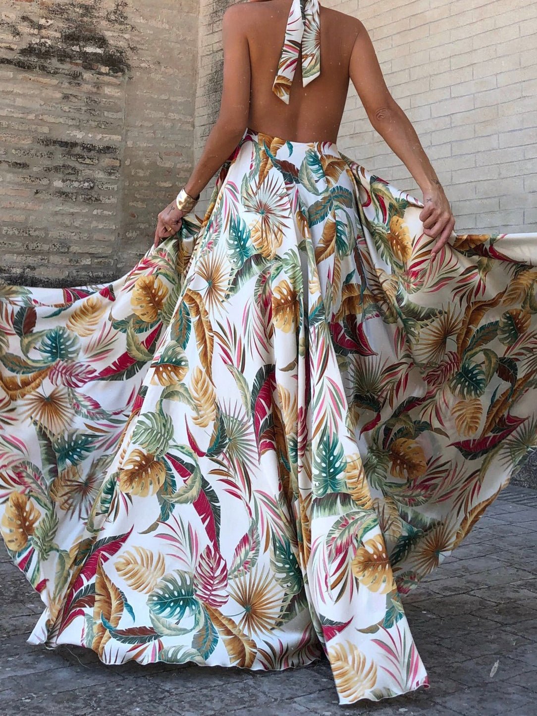 • Feature: Printed. Halter. Bare Back. Sleeveless