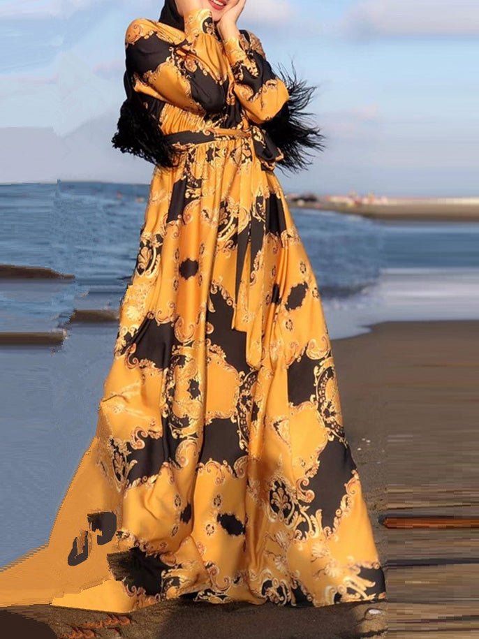 Women's Dresses Printed Lace-Up Long Sleeve Dress