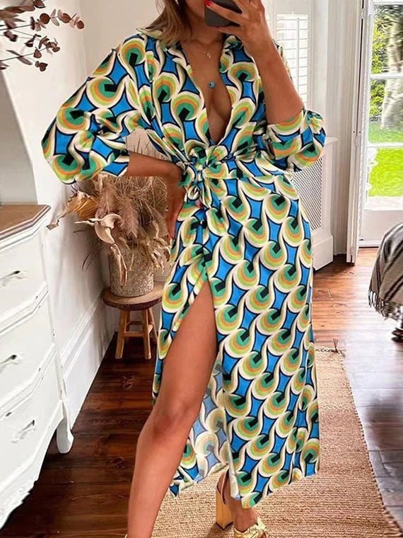 Women's Dresses Printed Lapel Tie Long Sleeve Slit Dress
