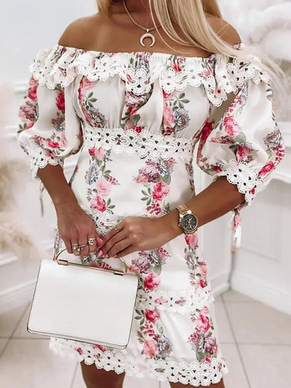 Women's Dresses Printed Off-Shoulder Lace Short Sleeve Dress