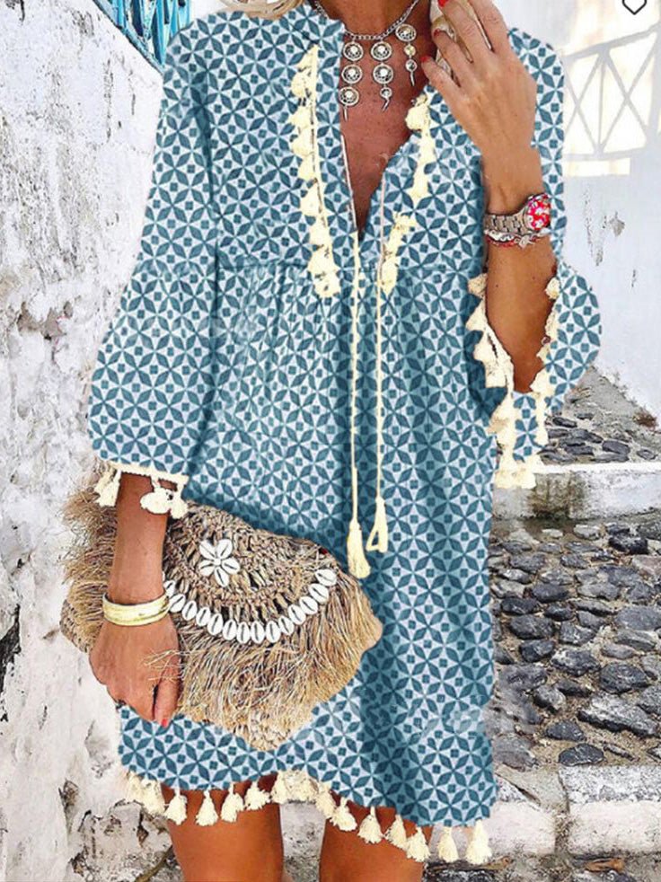 Women's Dresses Printed V-Neck Fringed Ruffle Dress
