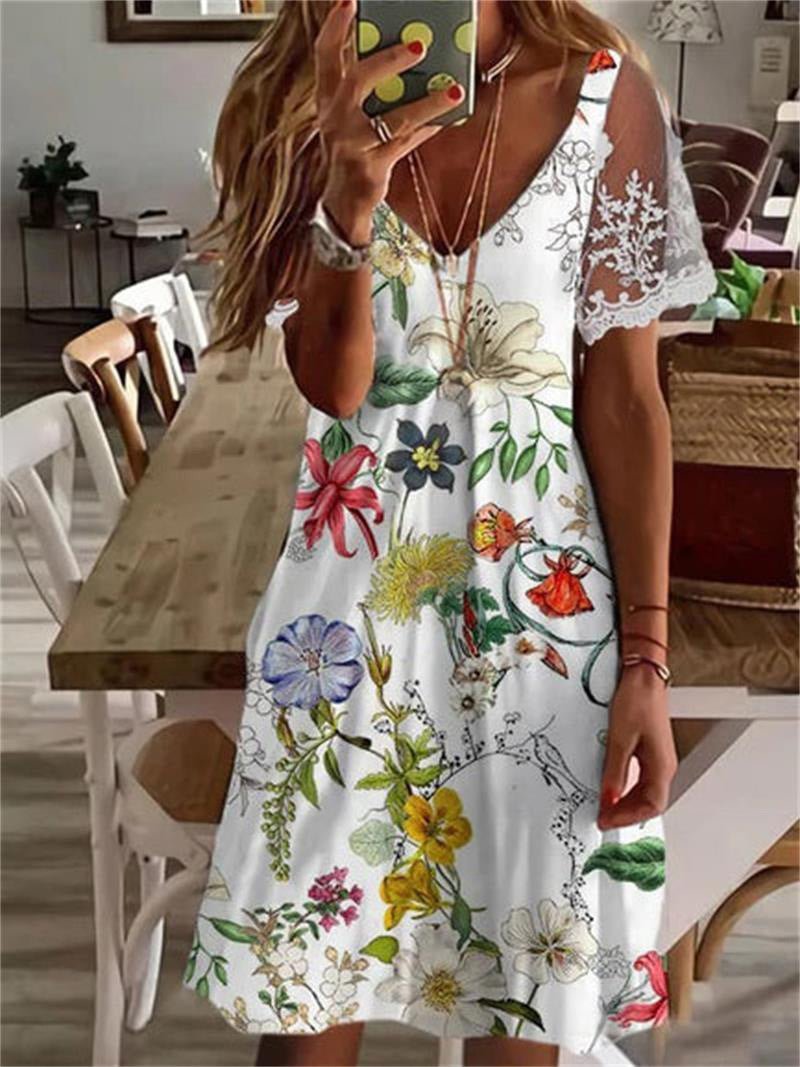 Women's Dresses Printed V-Neck Lace Sleeve Dress