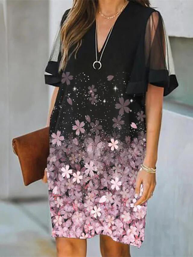 Women's Dresses Printed V-Neck Mesh Panel Short Sleeve Dress