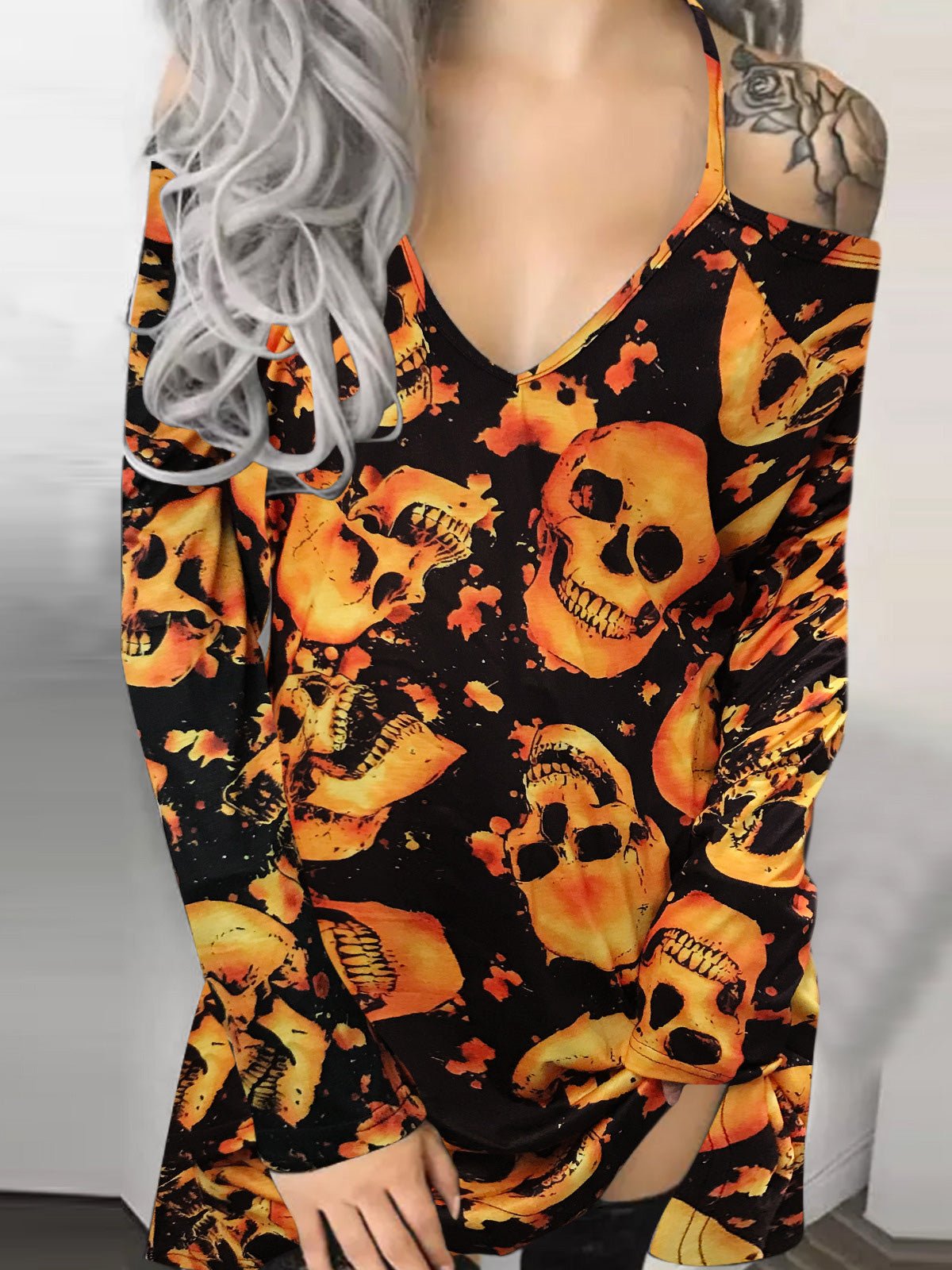 • Feature: Printed. V-Neck. Off-Shoulder. Long Sleeve