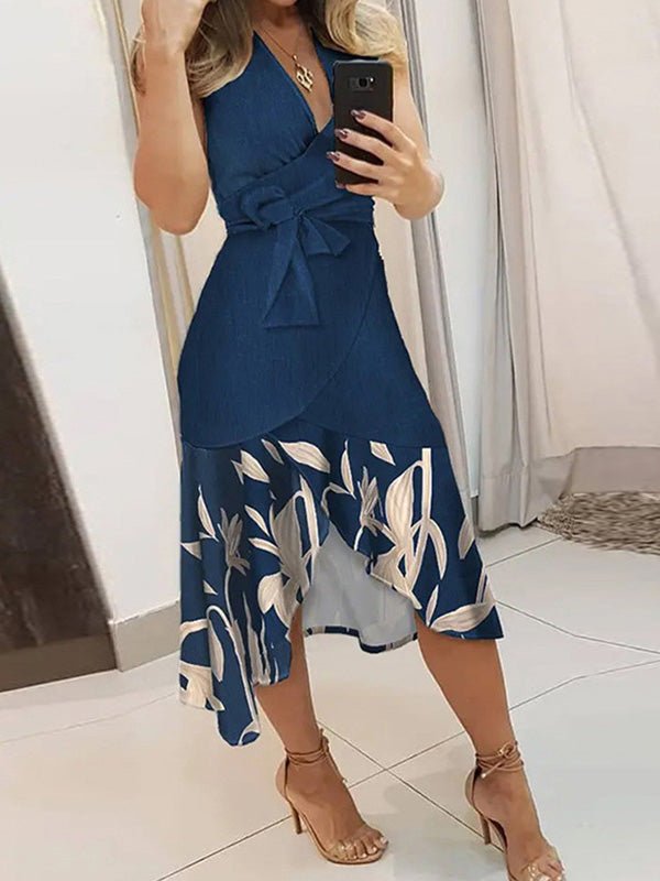Women's Dresses Printed V-Neck Tie Irregular Ruffle Dress