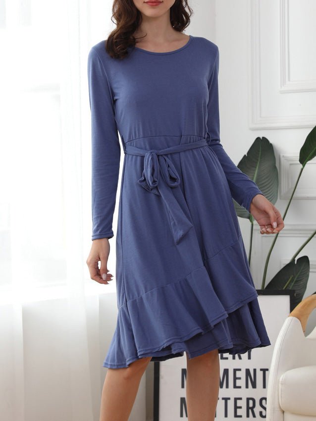 Women's Dresses Solid Tie Crew Neck Long Sleeve Ruffle Dress