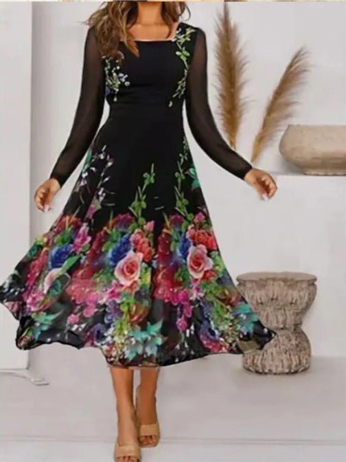 Women's Dresses Square Neck Mesh Long Sleeve Print Dress