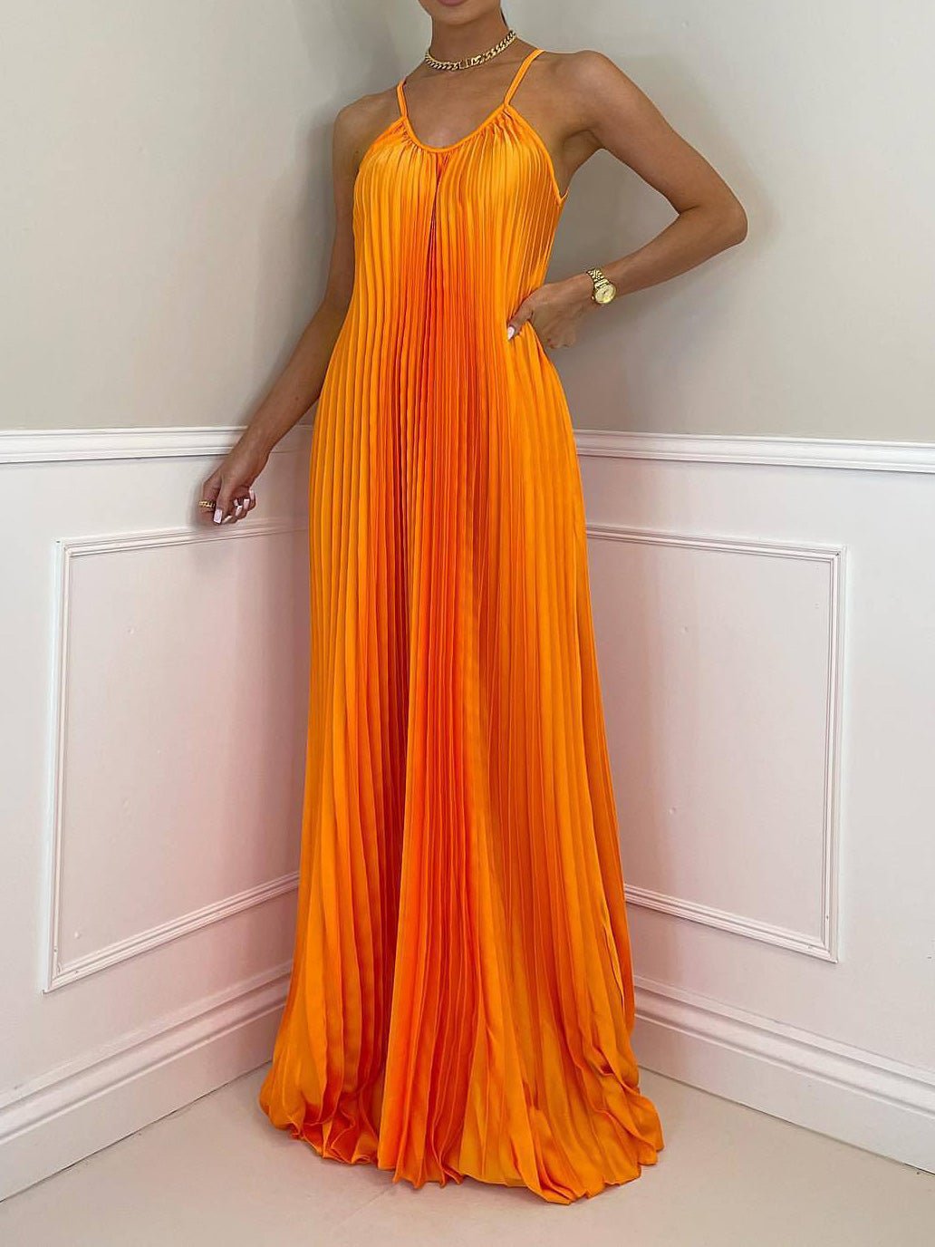 • Feature: Suspender. Halterneck. Pleated. Sleeveless