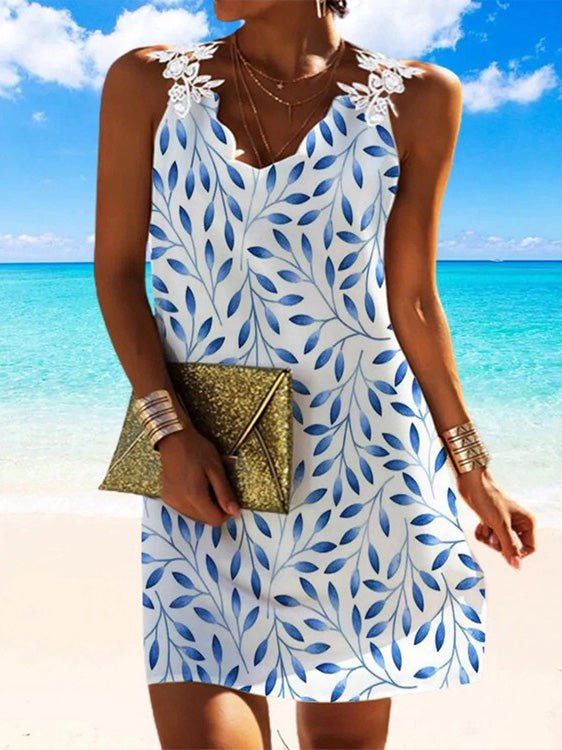 Women's Dresses Wavy Neck Leaf Print Lace Sleeveless Dress