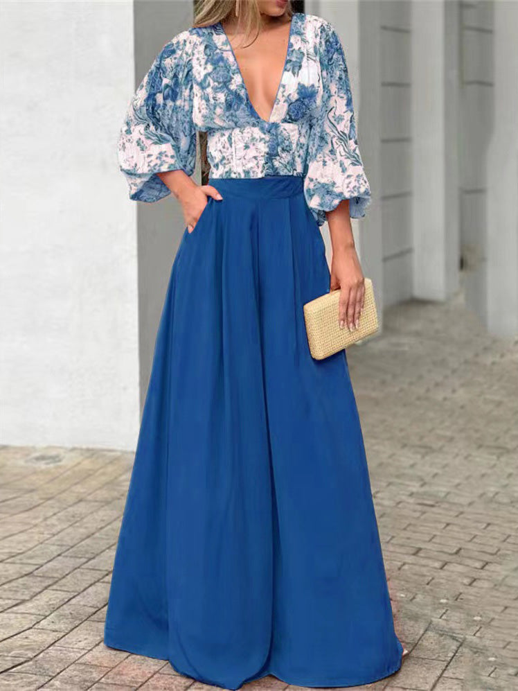 Women's Sets V-Neck Puff Sleeve Print Top & Wide Leg Pants Two-Piece Set