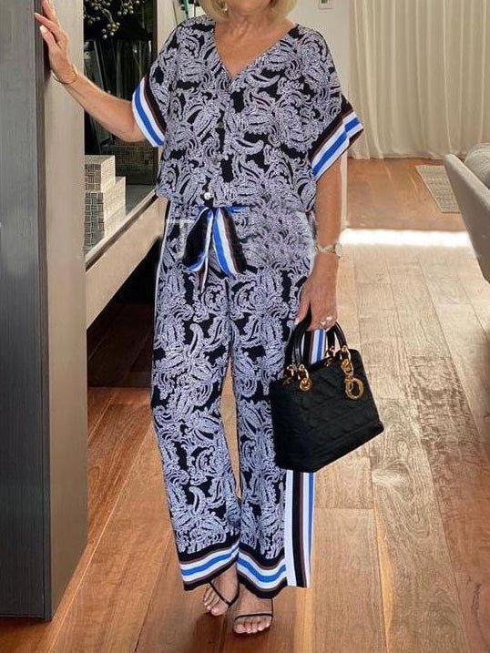 Women's Sets Vintage Stripe Print Top & Lace-Up Trousers Two-Piece Set