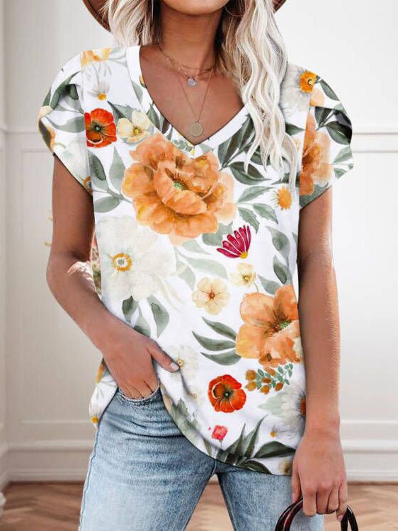 Women's T-Shirts Floral Print V-Neck Short Sleeve T-Shirt