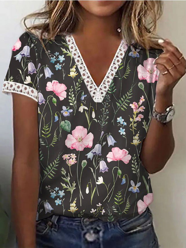 Women's T-Shirts Printed Lace V-Neck Short Sleeve T-Shirt