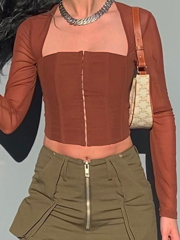 Women's T-Shirts Solid Hook Buckle Girdle Mesh Long Sleeve T-Shirt