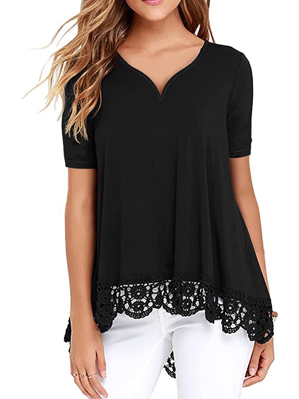 Exclusive! This T-shirt will not only make your face smile. but also show your sexy beauty! The V-neck and lace edge maintain the fashionable T-shirt shape of this shirt. but the cotton woven fabric and lace arc hem bring the ultimate touch.