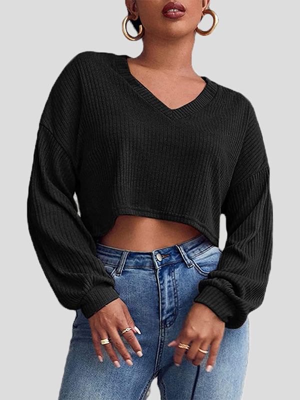 Women's T-Shirts Solid V-Neck Crop Long Sleeve Knit T-Shirt
