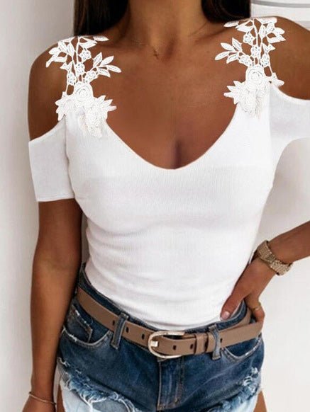 Women's T-Shirts Solid V-Neck Lace Off-Shoulder T-Shirt