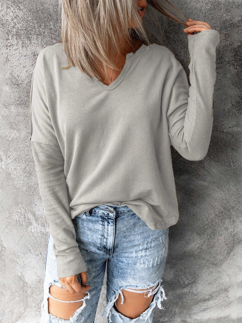 Women's T-Shirts Solid V-Neck Long Sleeve T-Shirt