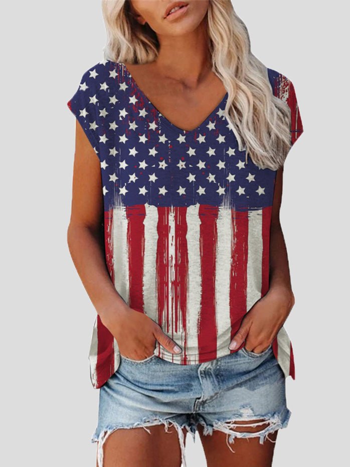 Women's T-Shirts V-Neck Star Stripe Print Short Sleeve T-Shirt