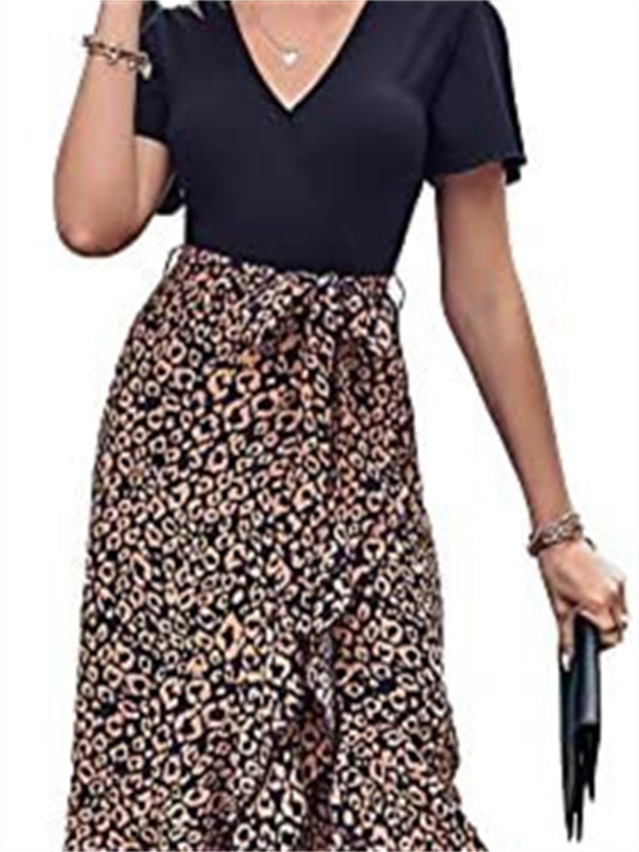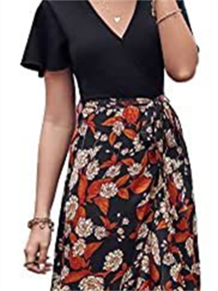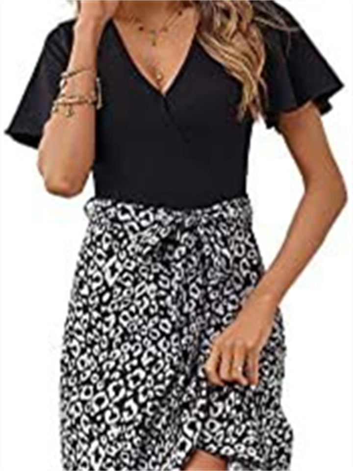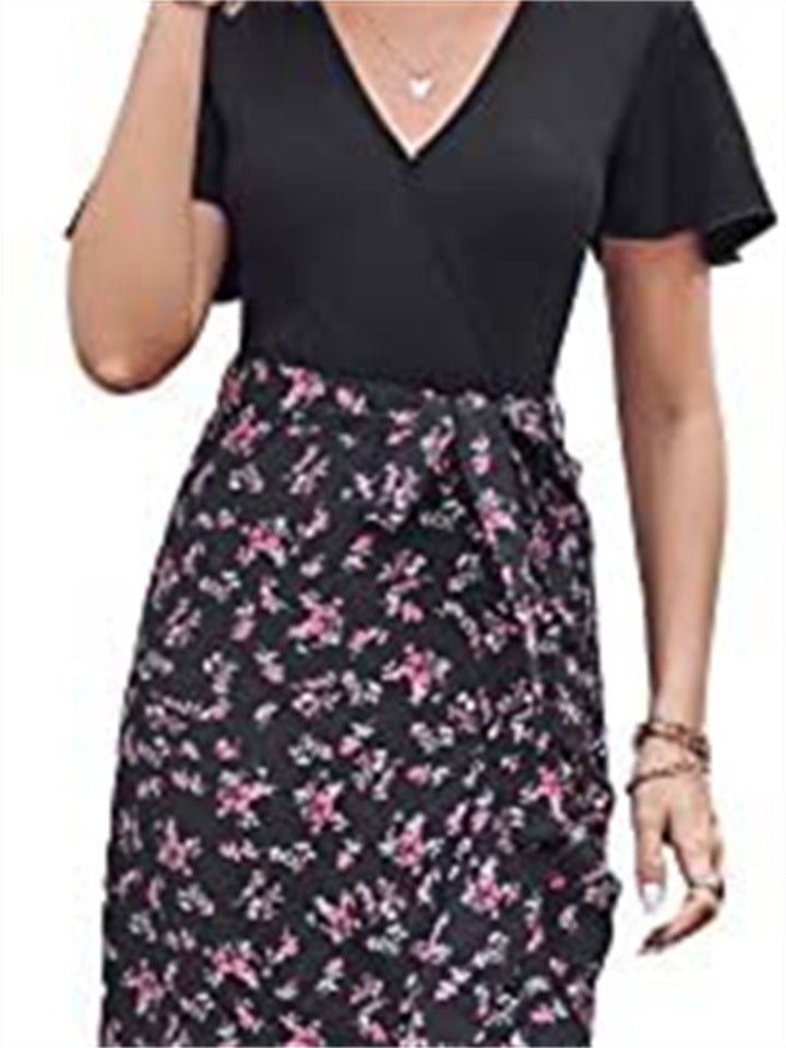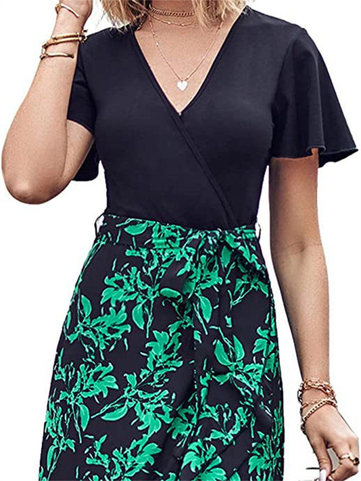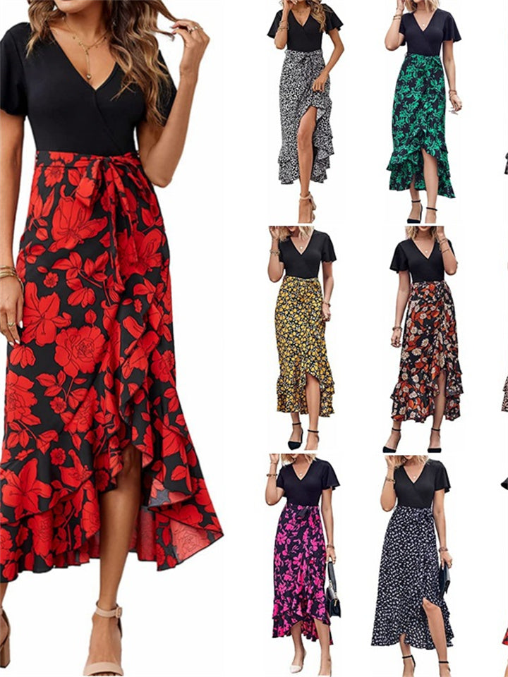 Women's V-neck High Waist Splicing Hem Irregular Open Short-sleeved Back Zipper Paragraph Printed Casual Wind Mid-length Dress Dress