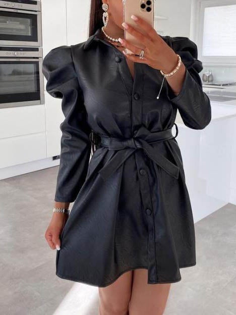 • Feature: Long sleeve. tie waist. button down. mini dress