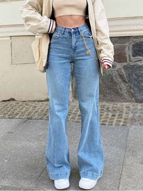 • Features: Button. pocket. zipper. denim. high waist. wide leg. fashionable